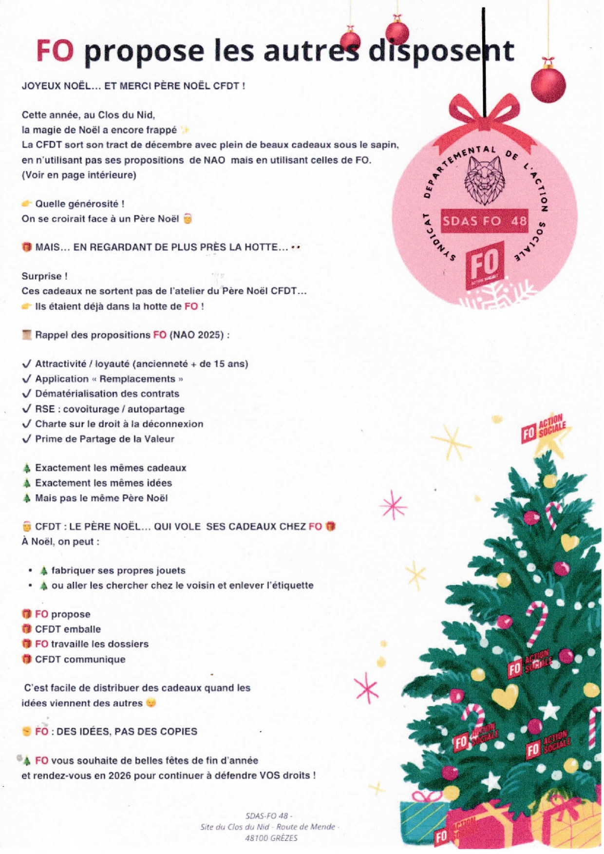 L'ACTU DU SDAS Facebook ME ACTU CLOS DU NID : NAO 2025 COMMUNIQUE INTERSYNDICAL LOZERE SUITE A LA MOBILISATION DU 1ER AVRIL : Lien : CCUE-CLASSIFICATIONS-REMUNERATIONS SELON FO CCUE : LES PROPOSITIONS DE FO