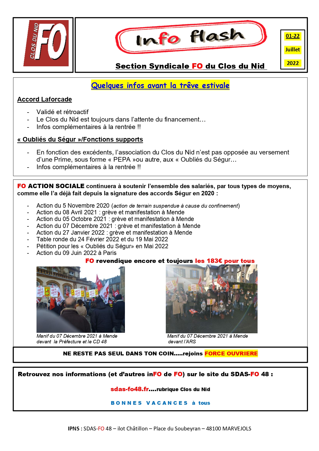 Propositions NAO Propositions du Syndicat Force Ouvrière NAO du mercredi 1er Juin 2022 - Faire un accord d'Entreprise pour les "Oubliés du Ségur" - Congés trimestriels pour l'Entreprise Adaptée - Négociation Prime PEPA Reconductible - Echelon Terminal